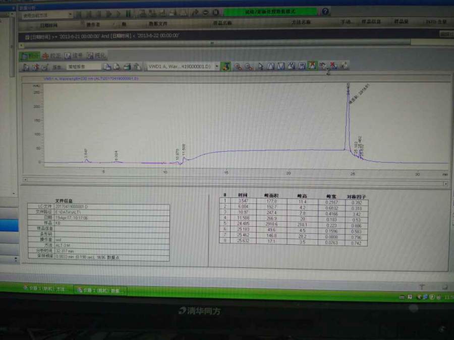我的流动相走的梯度B 甲醇 A 0.1%三氟乙酸 梯度是 0.01 B10% 0.5 B10% 8 B 90% 20 B90% 20.01 B10% 25 B10%结束 。 流速0.5 ,柱子是SB-C18,我走空白的时候如下图,基线有向上走坡的趋势,而且在24分钟有个很大的峰,我走过纯的甲醇是没有峰的,可以确定不是柱子上残留的其他样品,有大神知道怎么回事吗? @学术巨星 发自小木虫Android客户端 |