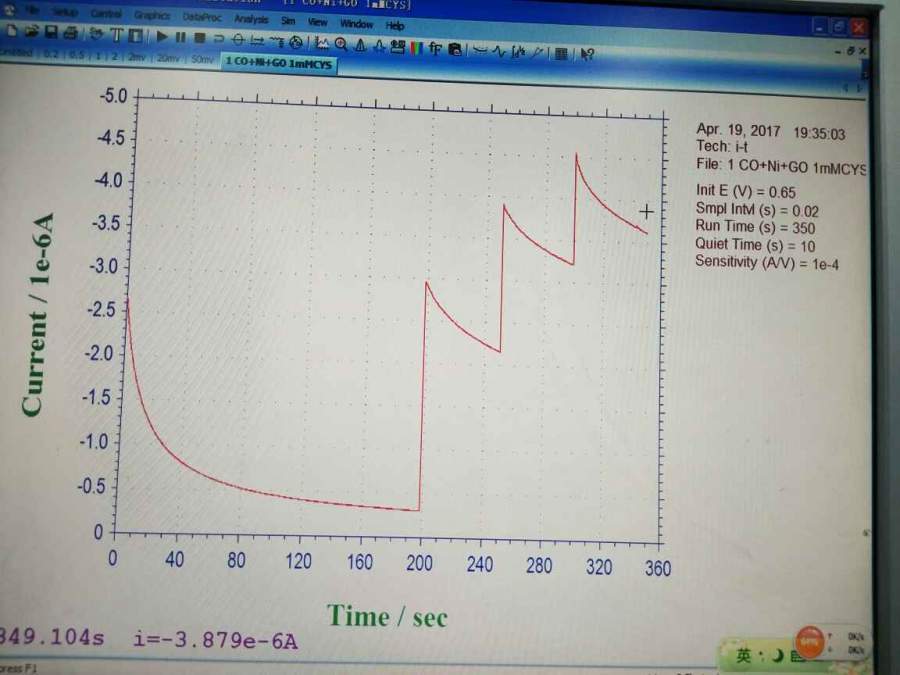 各位专家,学者,同学,我用水热反应合成得到了一个新的复合材料做电极,用三电极系统测对半胱氨酸的感应。底液为10mlPBS缓冲液,设定时间350秒,现在底液中运行200s后,递加100ul0.1M半胱氨酸,依次每50s递加,共三次,按推理递加后图为台阶刑,为什么我做的电流下降的这么快,得不到台阶呢 @langzhizhou 发自小木虫Android客户端 |