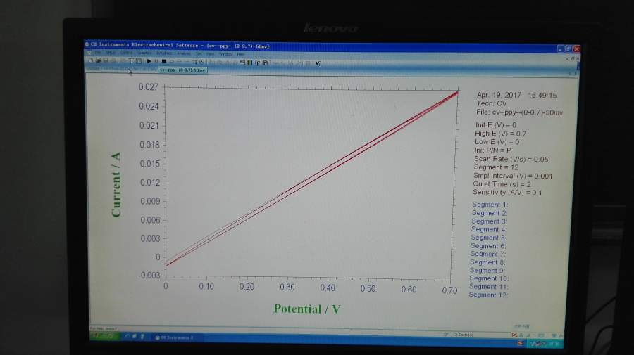 各位大侠,最近测试了PPY薄膜对称型固态超电容,但是出现CV极化严重,阻抗很大的现象,请帮忙分析原因,谢谢!PS:PVA/磷酸固态电解质,ppy薄膜导电性很好。