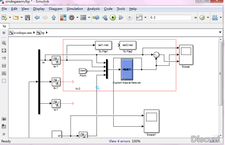 各位前辈,我用BP神经网络做电流滤波,先用matlab训练好了之后用gensim(net,st)函数生成了simulink模块(我用的是gensim(net,-1))。当把生成的模块直接复制到系统中用的时候,本来应该生成正弦波,结果出来的是方波。我训练网络用的数据就是从连接网络的这几个线路中取得值,现在直接连上用却不行,到底是哪里出问题了呢?是还需要对系统哪个地方进行进一步设置吗?求助~~请各位前辈不吝赐教~~~![]() BP训练结果 simulink仿真 仿真出现波形@wuming524 |
