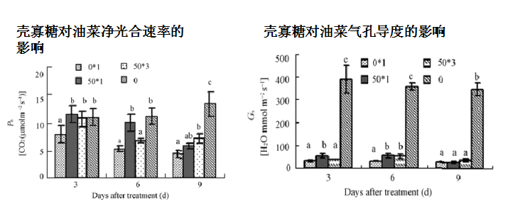 用50mg/L壳寡糖溶液喷施油菜的幼苗叶片后发现干旱胁迫下油菜叶片的净光合速率和气孔导度显著提高 数据来源:李 艳等,壳寡糖对干旱胁迫下油菜光合参数的影响。≤作物学报≥,2008, 34(2): 326−329。 1.png |