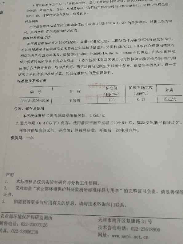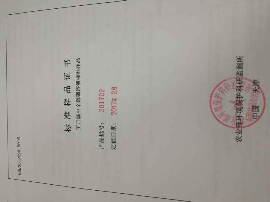 正己烷辛硫磷标准品样品证书上就有三个编号:GSB05-2296-2016? ?? ?产品批号:201702? ? CAS:141816-18-3 辛硫磷证书上面就只有这三个编号,如果加粗的是标准品编号,证书编号没体现呀 发自小木虫Android客户端 |