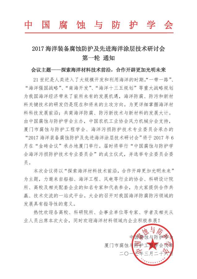 本内容由用户自主发布,如果其内容涉及到知识产权问题,其责任在于用户本人,如对版权有异议,请联系邮箱:xiaomuchong@tal.com - 附件 1 : 2017_海洋装备腐蚀防护及先进海洋涂层技术研讨会__第一轮通知(盖章).pdf