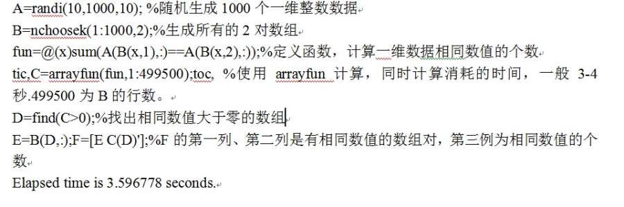 向量化函数可能可以! 可以用matlab 的arrayfun函数尝试解决。 下面例子是(假设一维的数据是10个)! A=randi(10,1000,10); %随机生成1000个一维整数数据 B=nchoosek(1:1000,2);%生成所有的2对数组 fun=@(x)sum(A(B(x,1), ==A(B(x,2), );%定义函数,计算一维数据相同数值的个数tic,C=arrayfun(fun,1:499500);toc, %使用arrayfun计算,同时计算消耗的时间,一般3-4秒.499500为B的行数。 D=find(C>0);%找出相同数值大于零的数组 E=B(D, ;F=[E C(D)'];%F的第一列、第二列是有相同数值的数组对,第三例为相同数值的个数 |