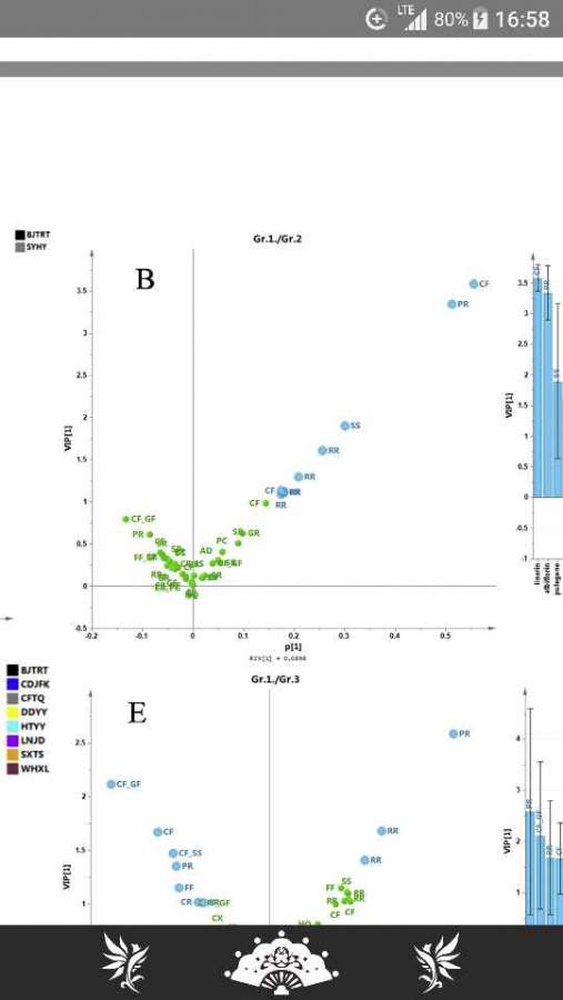 知道这个是先做opls-da,然后出VIP图,不过这种把两个组放在一起的确实不会了…看图好像左边是组一右边是组二,原文还能观察出组二cf这个成份的含量比组一高 求问这种图怎么做吖?另外VIP值不是两个组一起才能出一组吗,这个一个图里就有两个组的VIP值是怎么弄的呀?求大神解答,不胜感激啊!! 图片出处:A dynamic multiple reaction monitoring method for the multiple components quantification of complex traditional Chinese medicine preparations:niuhuang shangqing pill as an example,jian liang @klicking @鸭绿江畔 @wyy080214 @学术巨星 发自小木虫Android客户端 |