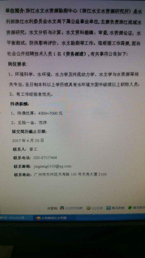 单位简介:珠江水文水资源勘测中心(珠江水文水资源研究所)是水利部珠江水利委员会水文局下属公益事业单位,主要负责珠江流域水资源研究,水文分析与计算,水文资料整编、审查,水资源论证,水平衡测试,防洪影响评价,水文勘测等工作。现根据工作需要,面向社会公开招聘技术人员1名(劳务派遣) 发自小木虫Android客户端 |