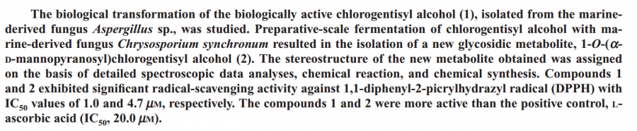 对从海洋真菌Aspergillus sp分离出的生物活性物质氯代龙胆醇(1)的生物转化进行了研究。用海洋真菌Chrysosporium synchronum进行的制备级发酵分离得到新的代谢物糖苷1-O-(aD-mannopyranosyl)chlorogentisyl alcohol (2),用详细的分光光谱数据分析,化学反应和化学合成的方法确定了这一新的代谢物的立体结构。化合物1和2都表现出显著的清除自由基1,1-diphenyl-2-picrylhydrazyl radical (DPPH)的活性, IC50值分别为1.0 和 4.7 mM。化合物1和2的清除自由基活性都比对照物L抗坏血酸 (IC50, 20.0 mM)的强。 |