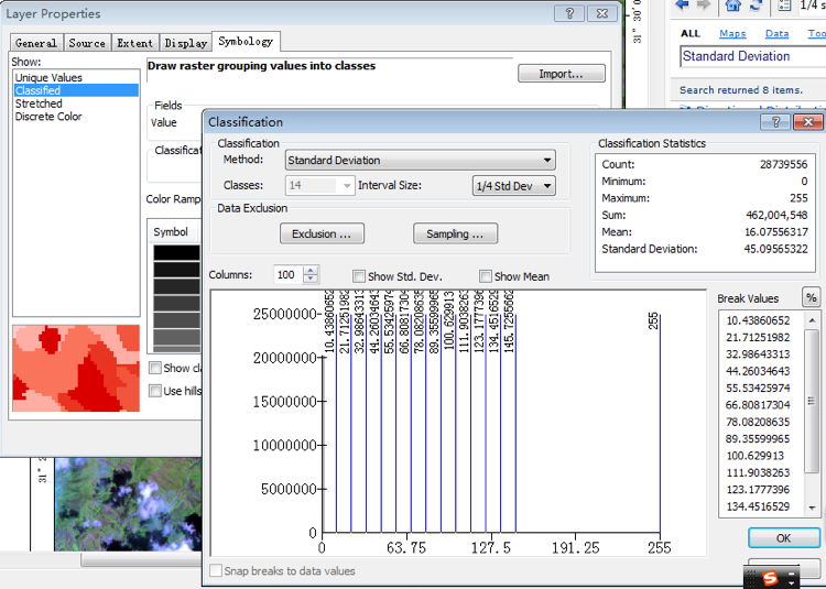 标准差分类和分位数分类是完全不同的两个概念,一个是按数据的统计特征,一个是按数据数量划分,可参考下面网页。 http://blog.sina.com.cn/s/blog_663d9a1f0102vdp9.html 但上面那个网页并没有介绍清楚原理。介意说一下: 1、楼主这里选用的1/4标准差就是用标准差的1/4大小做分类间隔(interval),间隔确定了,分类区间怎么定呢? 2、由于标准差分类是用于显示要素属性值与平均值之间的差异,分类区间则是由平均值向两边延伸,试着在分类面板勾选show std. dev. 和 show mean,明白了吧。大致就是下面这个图: | 1/4 std | 1/8 std : 1/8 std | 1/4 std | 1/4 std | mean 3、从楼主这个例子来看,均值是16.07,1/4std 是11.27,那么可以得到离均值最近的区间10.44-21.71,均值左边的区间min - 10.44, 右边的区间 21.71 - 32.98,…… 那么问题来了,看楼主的图发现右边有很明显的一个大分类区间(145.725-255),为什么这个区间没有按上面的规律划分。或者该分类方法的分类数是怎么确定的呢? PS:不是我卖关子,我确实不知道上述问题的答案。 PPS:从上面分析看楼主用这个分类方法,只有一类数据落在均值以下,这决非正态分布数据,实际上是不适合用标准差分类法的。 |