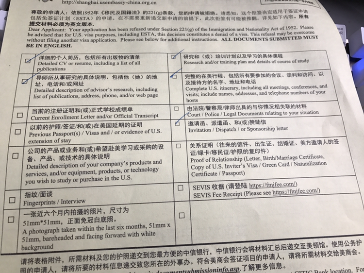 昨天去面签,签证官退回了护照以及一张黄色221(g)……需要补充的材料如下图,自己的CV已经写了,求问导师的具体从事研究该怎么写?仍然写一个CV?还有完整在美行程,参加完会议应该立即返回,没有其他安排,这样是不是只给一个会议的schedule就行了?先谢谢各位大佬回答。 发自小木虫IOS客户端 |