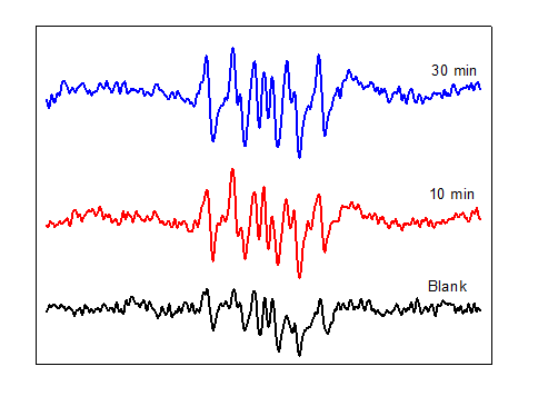 薄膜光催化体系,自由基抑制实验确定体系主要是超氧自由基起作用。用EPR验证,得下面的图。请大神帮我解析一下,到底有没有超氧自由基存在。 个人理解:自由基信号太弱,以致背景影响比较强。10min,30min能看到有1:1:1:1的峰出现(与Blank对比),并且30min的信号要强于10min。 请大家帮我分析一下。不胜感激。谢谢大家! 1.png@kinkilyou@lxg133298 |