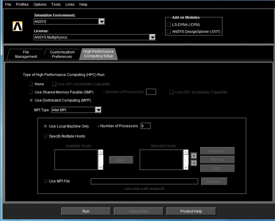 我用ANSYS APDL 循环热分析并行计算是采用的intel 的MPI 。MPI已经按照要求安装完成,并且目前的ansys的许可文件只支持10个核心并行,当我采用8核心计算的时候(如下图),计算一次循环,也就是一个时间步的时候就一直卡不动,但是用6个或者4个核心的时候 就可以计算,不知道是为什么,请大神们帮忙。 |