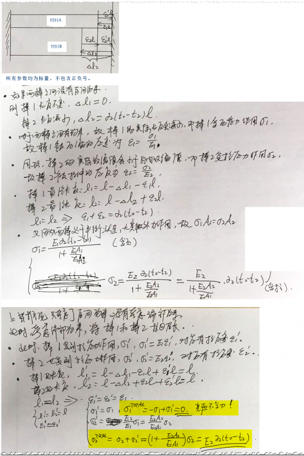 假设两种不同的材料A和B,层间完全接触,两端完全约束,如图所示。突然降低B的温度。请问,A和B横截面的应力是否相等?如果不相等,应该如何求? 路面结构.jpg@hwweven |