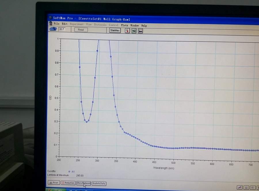 你这明显不是纳米金的吸收峰。。。请给出实物照片,什么颜色?