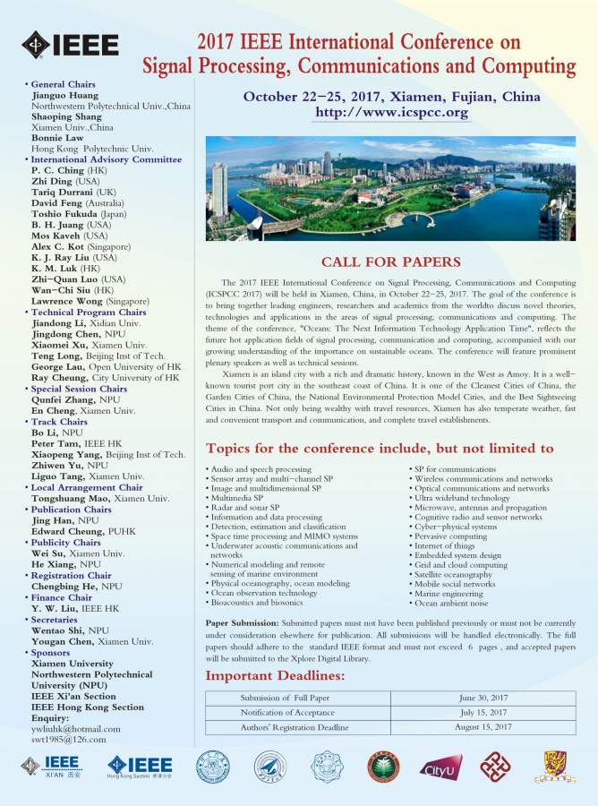2017 IEEE International Conference on Signal Processing, Communications and Computing October 22-25, 2017, Xiamen,www.icspcc.org 第 7 届IEEE国际信号处理、通信和计算大会(ICSPCC 2017)将于2017年10月22-25日在中国 厦门 举行。本次大会由IEEE西安分会、IEEE香港分会、厦门大学和西北工业大学联合举办,其目的在于汇集来自世界各地的专家学者及工程师共同研讨信号处理、通信和计算领域的新理论、技术和应用,并安排国际知名学者的大会报告、专题学术报告,新技术研讨。本次大会的主题是旨在共同研讨未来信号处理、通信和计算领域的热点理论方法和应用。 The 2017 IEEE International Conference on Signal Processing, Communications and Computing (ICSPCC 2017) will be held in Xiamen, China, in October 22-25, 2017. The goal of the conference is to bring together leading engineers, researchers and academics from the world to discuss novel theories, technologies and applications in the areas of signal processing, communications and computing. The theme of the conference, "Oceans: The Next Information Technology Application Time", reflects the future hot application fields of signal processing, communication and computing, accompanied with our growing understanding of the importance on sustainable oceans. The conference will feature prominent plenary speakers as well as technical sessions. 厦门,别称鹭岛,是国务院批复的中国经济特区,东南沿海重要的中心城市、港口及风景旅游城市。厦门市是一座风姿绰约的海上花园。城在海上,海在城中,构成了厦门的总体风格。岛、礁、岩、寺、花、木诸神秀相互映社,侨乡风情、闽台习俗、海滨美食、异国建筑融为一体,四季如春的气候更为海的魅力锦上添花。今年9月金砖五国会议将在厦门召开,会后厦门将变得更加美丽,更具有吸引力。ICSPCC2017的与会代表将会分享厦门的魅力。 Xiamen is an island city with a rich and dramatic history, known in the West as Amoy. It is a well-known tourist port city in the southeast coast of China. It is one of the Cleanest Cities of China, the Garden Cities of China, the National Environmental Protection Model Cities, and the Best Sightseeing Cities in China. Not only being wealthy with travel resources, Xiamen has also temperate weather, fast and convenient transport and communication, and complete travel establishments. ICSPCC 2017会议论文集将由IEEE出版,收录在IEEE Xplore, 并被EI Compendex 全文检索。(ICSPCC 2011~2016已经被EI Compendex 全文检索 ) All Proceedings papers in ICSPCC2011 to 2017 can be searchable in IEEE Explore and EI. Contact Information联系信息 E-mail: ywliuhk@hotmail.com Important Date <!--[if !supportLineBreakNewLine]--> <!--[endif]--> Submission of Full Paper : June 30, 2017 Notification of Acceptance : July 15, 2017 Authors’ Registration Deadline : August 15, 2017 Topics include, but not limited to •Audio and speech processing • Underwater acoustic communications and networks • Image and multidimensional SP • Multimedia SP • Radar and sonar SP • Information and data processing • Detection, estimation and classification • Space time processing and MIMO systems • Sensor array and multi-channel SP • Grid and cloud computing • Numerical modeling and remote sensing of marine environment • Marine engineering • Ocean observation technology • Bioacoustics and biosonics • SP for communications • Wireless communications and networks • Optical communications and networks • Ultra wideband technology • Microwave, antennas and propagation • Cognitive radio and sensor networks • Cyber-physical systems • Pervasive computing • Internet of things • Embedded system design • Physical oceanography, ocean modeling • Satellite oceanography • Mobile social networks • Ocean ambient noise Sponsor IEEE西安分会,IEEE香港分会,厦门大学, 西北工业大学 IEEE Xi’an Section, IEEE Hong Kong Section, Xiamen University, Northwestern Polytechnical University Co-sponsor 西安电子科技大学、北京理工大学、香港城市大学、香港理工大学、香港中文大学 Xidian University, Beijing Institute of Technology, The City University of Hong Kong, The Hong Kong Polytechnic University,The Chinese University of Hong Kong Website会议网站: www.icspcc.org ICSPCC2017.jpg 西工大IEEE单页排20170502.jpg [ Last edited by swt1985 on 2017-5-27 at 10:46 ] |