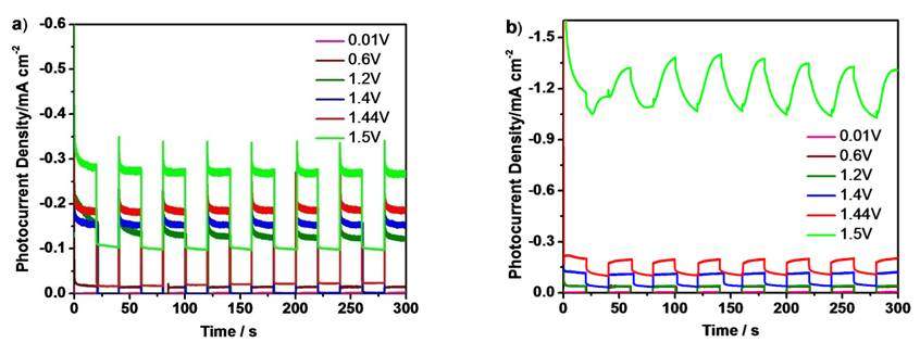 图左和右分别是TiO2/ITO电极和Ag- TiO2/ITO电极在不同电压下的计时电流测量。就是光照和非光照的电流-时间曲线。请问右边的图1.5V时的曲线为什么不再是平的了??由此能得出什么结论吗??急急急!!! 图片1.jpg |