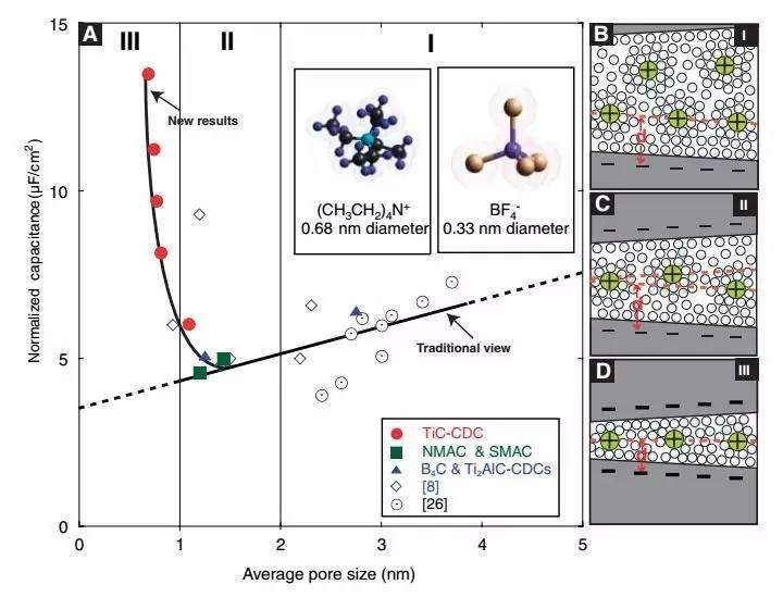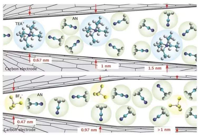 撰文:DJ 编辑:LBA 有效比表面统一为能够有效和电解质接触的表面,其大小即为有效比表面积。前面介绍到,双电层电容的大小与材料的有效比表面积有关。材料的比表面积是其孔性质的一个表现。材料的孔结构和比表面积的相关测试可以参考公众号之前的文章(那些年我们一直纠结的BET | 来,干了这碗BET | 真理无孔不入——微孔大孔材料结构的分析方法 | 知识的搬运工——气体吸脱附实验细节 | 如何一步一步处理BET(N2吸脱附)的原始实验数据)。研究孔大小对于材料的电容的影响具有重要意义。 电池是将能量储存到化学键当中,而电容器却是依靠电解质离子和电极表面的静电分离来储存能量。电容器有各种不同的电解质体系,不同的电解液具有不同的电压窗口,不同电极材料亲和能力,不同的电解质其离子半径也不同。一些常用电解质的离子半径。(数据整理自:https://world-science.ru/en/article/view?id=31409;http://www.wiredchemist.com/chem ... emical-radii-anions; https://www.webelements.com/lithium/atom_sizes.html; https://en.wikipedia.org/wiki/Ionic_radius) 电解质溶解在溶剂当中,发生电离。阴阳离子都会吸附溶剂分子。因此在溶液当中自由移动的是溶剂化后的离子,其离子半径大小也比原来的离子半径要大。一般认为,如果炭材料的孔大小小于1 nm,那么大部分溶剂化后的离子将无法进入,因此也不会提供电容。 2006年,Gogotsi课题组发现,小于1 nm能够提供非常大的电容。作者选用了碳化物(TiC,B4C,Ti2AlC)衍生炭材料。高温下Cl2能够腐蚀碳化物,生成易挥发的金属氯化物,从而得含有孔的炭材料。氯化温度不同,得到的炭材料的孔结构不同。碳化物衍生炭的最大的一个特点就是孔径分布很窄,适合作为模型物质进行研究。 随着氯化温度的升高,材料的导电性变好,比表面积增加,平均孔径也由0.7 nm增加到1.1 nm。但是这些材料中平均孔径为0.7 nm的材料的比表面电容确实最大的,而且随着平均孔径的增大,这个值反而越小。作者使用的电解质是TEABF4/AN,离子的溶剂化半径是要大于1 nm的,之前的观点认为离子是无法进入到比其溶剂化离子小的孔中,而这个结果恰好反驳了之前科学家们的一贯认识。作者认为,溶剂化的离子能够发生变形,就像将一个气球挤进一个比气球半径稍小的孔中一样。而这种部分去溶剂化的离子将于电极材料靠的更近一些,也就是说其d值更小一些,因此反而能提高其电容。如果孔径大到可以能容纳扩散层的化,那么比表面电容值将不再变化,材料的质量电容也随着比表面积的增大而增大。 上面的作者认为,d值得减小是电容增加的原因,而作者课题组试图以化学方式来解释其能量的来源。2008年,作者课题组针对这个问题进行了进一步的研究。 同样是选用碳化物衍生炭。作者最后计算了电容器的储存的能量,这个能量和电解质的溶剂化能量相近。因此,作者认为充电的时候溶剂化的电解质离子进入到小于溶剂化离子半径的孔中,发生去溶剂化;而放电的时候电解质离子释放出来,再发生溶剂化,所以能够储存更多的能量。 孔径大小对于电容的影响的研究仍在继续。虽然,碳化物衍生炭的孔径分布很窄,但是毕竟同时存在不同大小的孔。且其孔径无法达到更小,也就是说小于电解质离子大小的孔径。前面论文中看到是从0.7 nm到1 nm下降的线,如果把孔径继续减小,会不会增加,会不会出现一个最大值。 2015年,Amaratunga终于找到一个合适的模型物质来进行研究。作者把目光投向了现在仍然火热的石墨烯。不过他选用的是GO。石墨的层间距是0.165 nm,层与层之间是依靠范德华力而连接的。这个距离显然比大部分电解质离子半径都要小,且石墨层之间的作用力相对较大,要用很强的氧化剂才能撑开。因此作者巧妙的选用了GO作为研究对象,以层间距替代孔径大小,用原位XRD来检测其层间距的变化。 由于表面含有丰富的含氧官能团,因此GO的层间距为0.82nm。当GO浸入到PC溶液中时,PC分子会进入到层间,继续撑大层间距。作者定义: Δd = dn – d0 D可以视为材料的孔径。将GO制成电极,在TEABF4/PC溶液中进行CV测试,用原位的XRD检测材料的层间距变化。随着循环次数的增加,材料的层间距慢慢变大,D值从0增加到了0.9 nm。因此,作者可以观察电容随着孔径变化的情况。 作者得到的结论是在0.7 nm的孔径的时候,电容值最大,因为这个大小刚好够TEA+(0.68 nm)离子进入。这个结果正好印证了Gogotsi课题组的结果,也是对其的一个补充。 原位实验一直是探究机理的很好手段,下面章节中将会介绍几个使用原位实验来检测双电层过程。 参考文献: 1. Anomalous increase in carbon capacitance at pore sizes lessthan 1 nanometer, Science 313 (5794), 1760-1763. 2. Desolvation of Ionsin Subnanometer Pores and Its Effect on Capacitance and Double‐\Layer Theory, Angewandte Chemie 120 (18), 3440-3443. 3. UnderstandingCapacitance Variation in Sub-Nanometer Pores by In-Situ Tuning of InterlayerConstrictions, ACS Nano, 2016, 10 (1), 747–754. 声明:本文由研之成理出品。转自微信公众号。 表1.jpg |
