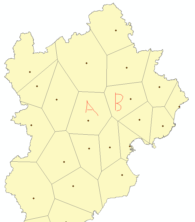 arcmap中建立了泰森多边形,并在其属性表中计算了面积,但好像有的不合理?不知道我的操作过程什么地方出错? 下图A、B两部分面积看起来应该差不多,但计算结果显示A、B两部分面积差8倍! 捕获.PNG |