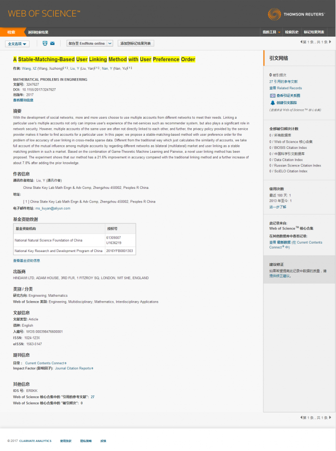 要一个截图就行了,谢谢大家 论文题目:A Stable-Matching-Based User Linking Method with User Preference Order 期刊:MATHEMATICAL PROBLEMS IN ENGINEERING |