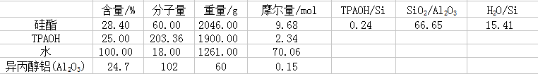 | 合成ZSM-5晶种的混合液组成配比为TPAOH:SiO2:Al2O3:H2O=24:100:1.5:1541,药品规格为:四丙基氢氧化铵(25% wt)、硅源选用正硅酸四乙酯(密度:0.932-0.936,以SiO2计〉=28.4%)、铝源选用异丙醇铝(以Al2O3计〉=24.7%)。请问各位大神,我在称量时怎么计算。比如以0.15molAl2O3计算。 |