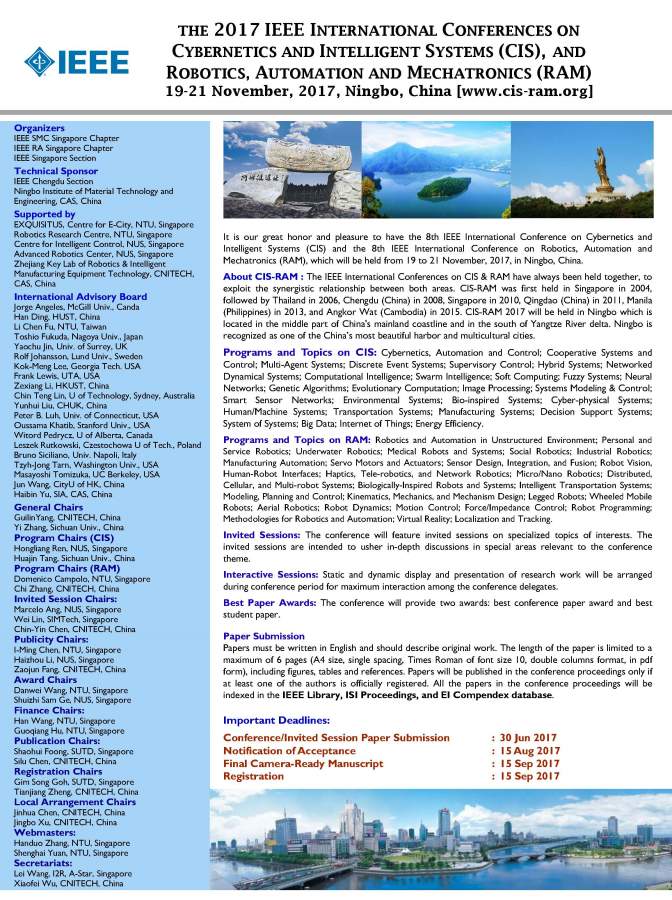 2017 IEEE International Conferences on Cybernetics and Intelligent Systems£¨CIS£© and Robotics, Automation and Mechatronics£¨RAM£© ¾Ù°ìʱ¼ä£º2017.11.19-2017.11.21 µØµã£º Õã½ Äþ²¨ ´ó»á¹ÙÍø£ºwww.cis-ram.org ¼ìË÷£º IEEE Library, ISI Proceedings,and EI Compendex database »áÒéÖ÷ϯ£º Guilin Yang, CNITECH, China Yi Zhang, Sichuan Univ., China Õ÷¸åÖ÷Ì⣺£¨°üÀ¨ÇÒ²»ÏÞÓÚ£© 1. ¿ØÖÆÂÛ¡¢×Ô¶¯»¯¿ØÖÆ 2. ÖÇÄÜϵͳ 3. »úÆ÷ÈËѧ 4. µçÆø¹¤³Ì 5. »úµçÒ»Ì廯 Ͷ¸åµØÖ·£º https://easychair.org/conferences/?conf=cisram2017 Ö÷Òª×éÖ¯µ¥Î»£º Öйú¿ÆÑ§ÔºÄþ²¨¹¤ÒµÑо¿Ôº ÐÂ¼ÓÆÂÄÏÑóÀí¹¤´óѧ ÐÂ¼ÓÆÂ¹úÁ¢´óѧ »áÒ齨¸åÈÕÆÚ£º 2017.06.30 ÁªÏµ·½Ê½£º Öйú¿ÆÑ§ÔºÄþ²¨²ÄÁϼ¼ÊõÓ빤³ÌÑо¿ÔºÏȽøÖÆÔìËù Õã½Ê¡Äþ²¨ÊÐÕòº£ÇøÖйÙÎ÷·1219ºÅ 0574-86324587 CIS-RAM 2017 CFP-2_19635.jpg |