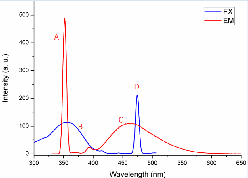 最近测得一化合物荧光图谱如下: 激发谱和发射谱分别是B峰和C峰,那么A、D峰又是什么呢?为什么对称性这么好呢?不是倍频峰,会不会是瑞丽散射峰呢? 2U{}~20@J~]SWTVB$CJMGNJ - 副本.png |