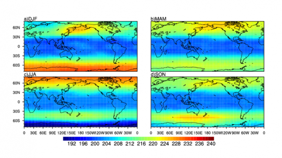 大气学渣求学霸前辈拯救。如图是14—21km高度的大气层的各季节全球均温,用共15年的saber/timed数据得到的。可以看出第一张图(北半球冬季)在白令海峡附近有温度较高的中心区域,第四张图(北半球秋季)在澳洲南部也有温度较周围高的区域,请问这可能是什么原因造成的? Figure3-ave-latlon-tem-14-21km.png |