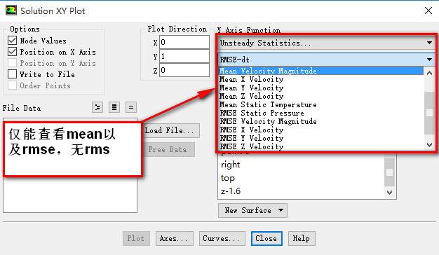 软件为ANSYS17.0,选用非稳态k-e模型,开了时间统计项,统计完毕之后无法查看到RMS值,在XY-plot界面的非稳态统计项内只能看到mean值以及rmse值,无法查看rms值。请问哪位大神知道怎么查看吗?多谢。 1.jpg |