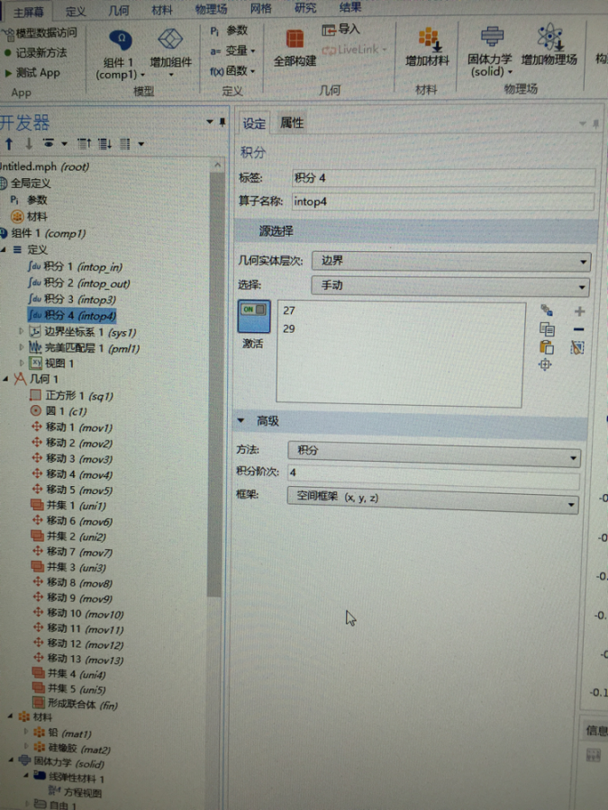 如图一所示,我在边界27 29上定义了积分算子intop4,后来使用了intop4(solid.disp) (如图二所示),但是括号里应该是积分表达式,并不是积分变量,我其实想写出图三所示的表达式,因为我没法看到intop4算子的积分变量是怎么写的,我就没办法自定义出图三所示的ds