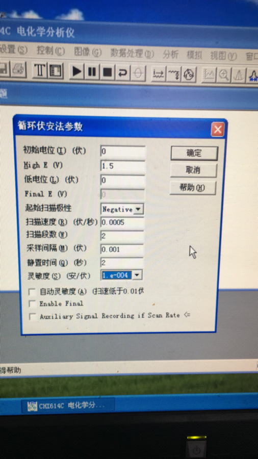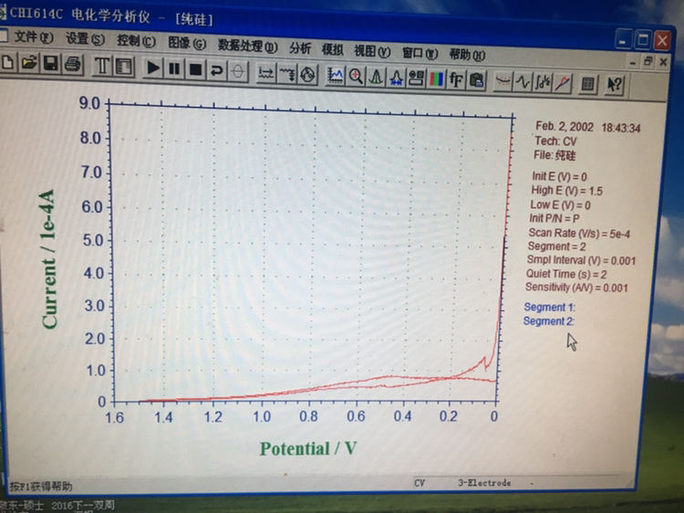 初次用CHI614电化学工作站测试扣式电池循环伏安曲线,测出来的曲线看不到负电流,峰也看不到,工作电极材料是硅,连接应该没有错误,有人知道这什么情况吗?交流一下,谢谢