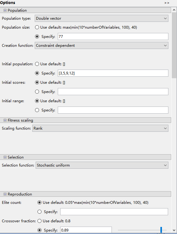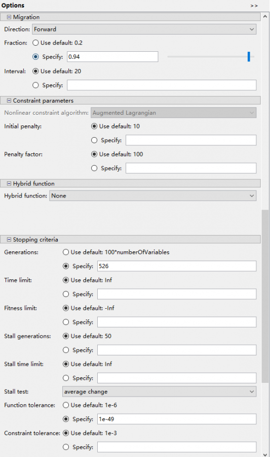 想请教各位高手如何在matlab的文本处设置优化的参数,就是不在优化工具箱里手动填优化的设置,想在文本处写这些设置,这两个图是我设置的参数,为了方便看清哪个参数写在文本的哪个位置,我截的两张图里的参数给的都比较诡异。请指教!非常感谢!! 1.png 2.png |