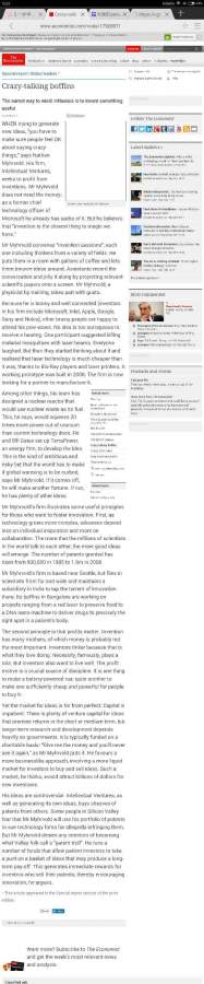 His ideas are controversial. Intellectual Ventures, as well as generating its own ideas, buys sheaves of patents from others. Some people in Silicon Valley fear that Mr Myhrvold will use his portfolio of patents to sue technology firms for allegedly infringing them. But Mr Myhrvold denies any intention of becoming what Valley folk call a “patent troll”. He runs a number of funds that allow patient investors to take a punt on a basket of ideas that may produce a long-term pay-off. This generates immediate rewards for inventors who sell their patents, thereby encouraging innovation, he argues.