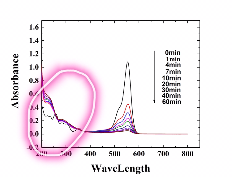 这张图是在类fenton体系下得到的RhB的紫外可见全波普图,请问圈起来的那部分的黑线怎么解释?