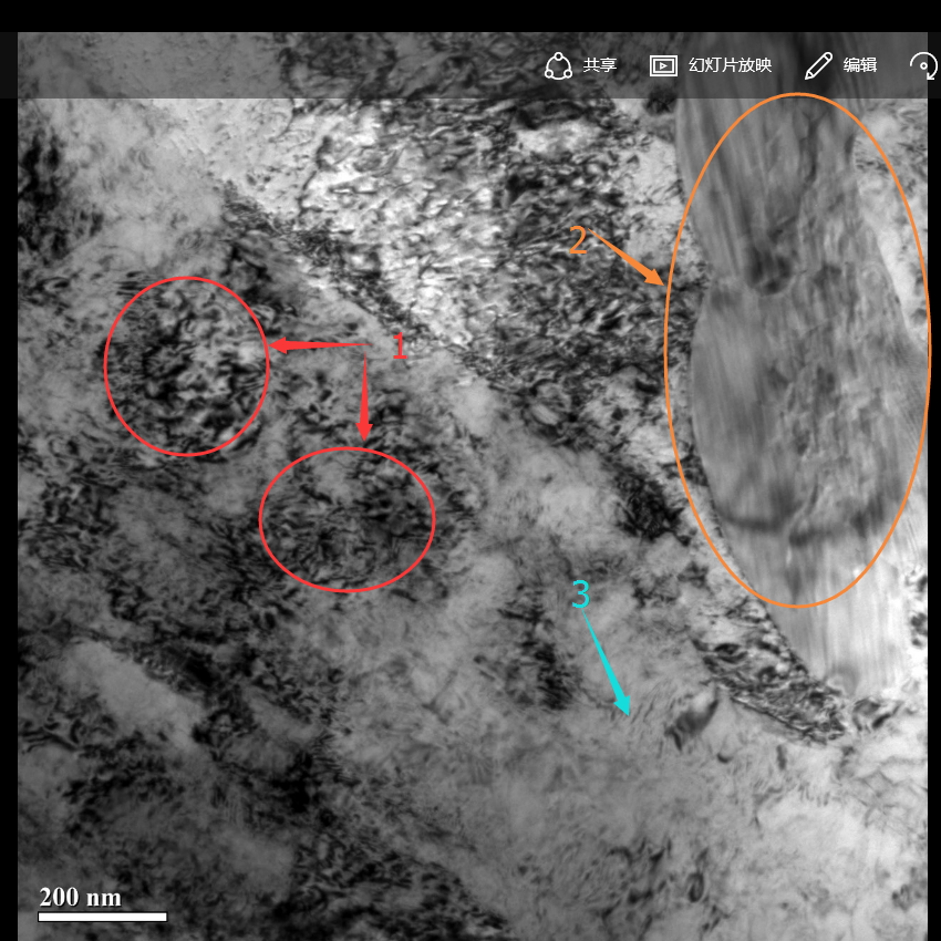 各位前辈,第一次做透射电镜不知如何下手,请前辈们指点,下面两幅明场相能得出什么结论。 加工工艺:激光熔覆(类似焊接组织) 材料:马氏体不锈钢 组织:通过XRD及SEM分析,可得到基体为马氏体,但是析出相无法确定,因此做了TEM 推测析出相有:铁碳化物,铬碳化物,NbC,硼化物, 我有如下问题 图1:红色线圈出部分为什么那么虚,是一种相吗?还是因为制样产生的现象 图2:大概有三种形态,3号箭头指的区域代表基体,1,2号箭头分别为两个种相,我要分别打这三个区的衍射斑点,对吗? |