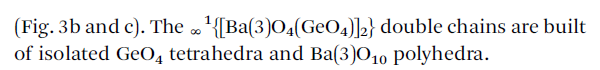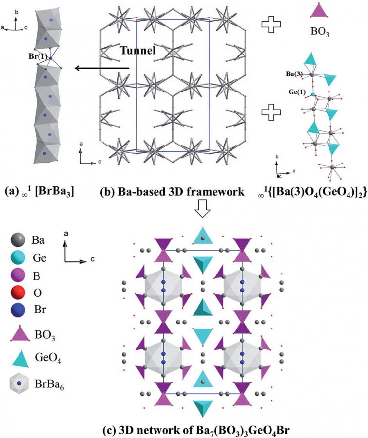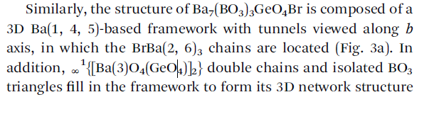 Similarly, the structure of Ba7(BO3)3GeO4Br is composed of a 3D Ba(1,4, 5)-based framework with tunnels viewed along b axis, in which the BrBa(2, 6)3 chains are located (Fig. 3a). In addition, {[Ba(3)O4(GeO4)]2} double chains and isolated BO3 triangles fill in the framework to form its 3D network structure (Fig. 3b and c). The {[Ba(3)O4(GeO4)]2} double chains are built of isolated GeO4 tetrahedra and Ba(3)O10 polyhedra.