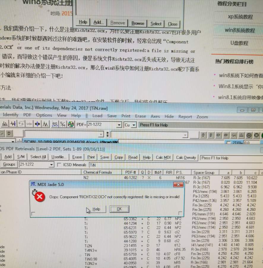 我也是才解决这个问题(见图片),当时搜索卡片不能显示,所以百度,http://www.xitongpan.com/xtjc/win8/2695.html这个链接可以直接看解决办法。文字我也贴在下面了:![]() “首先,我们需要介绍一下,什么是注册Richtx32.ocx,为什么要注册Richtx32.ocx?也许很多用户在操作Windows系统的时候都遇到过这样的难题吧,在安装软件的时候,经常会出现“Component 'RICHTX32.OCX' or one of its dependencies not correctly registered:a file is missing or invalid”错误,而导致这个错误产生的原因,便是系统文件Richtx32.ocx丢失或无效,导致无法注册,这个时候的解决办法便是注册Richtx32.ocx,那么在win8系统中如何注册Richtx32.ocx呢?下面系统盘之家小编就来详细的介绍一下吧! 1.首先,我们需要自行到网上下载Richtx32.ocx文件,下载之后,我们将文件解压。 2.之后,我们需要先查看一下系统类型,操作方法如下:我们返回到win8系统的传统桌面位置,然后右键点击桌面的这台电脑图标,选择属性。在弹出来的属性窗口中,我们就可以查看到系统类型了,是32位或者是64位。 3.查看系统类型之后,如果是32位系统,将Richtx32.ocx复制到C:\Windows\System32目录下;64位系统,Richtx32.ocx文件复制到C:\Windows\SysWow64。 4.最后一步,我们同时按下键盘上的win+R快捷键打开电脑的运行窗口,然后在窗口中输入cmd并单击回车,之后,32位系统,输入“regsvr32 richtx32.ocx”,64位系统,输入“cd c:\windows\SysWow64”,回车,最后输入“regsvr32 richtx32.ocx”,等待系统执行完毕我们重启一下自己的win8电脑即可。” 我想说的是:我用的win7,在第四步没有重启电脑只是重启jade5.0照样可以用。这里我上传的Richtx32.ocx,大家可以直接下载安装到C盘,或者就直接点上面的链接。 ![]() IMG_20170524_192854.jpg |