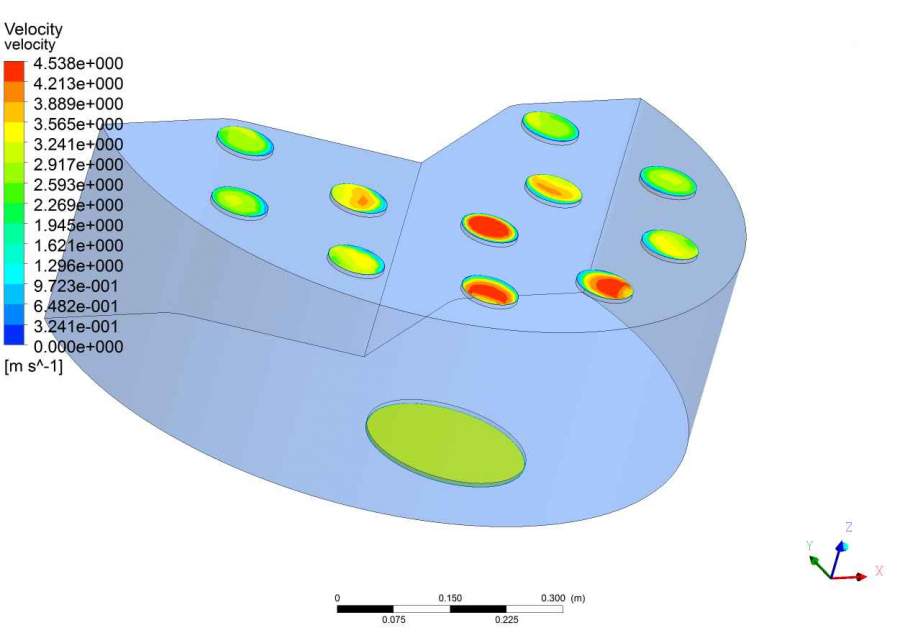 如图所示,图中底部是入口的位置,设置的是速度入口,上边11个小的出口,液体从入口流入,从11个小出口流出,现在仿真这11个小出口的流速,这11个小出口应该设置什么边界条件?我按照压力出口设置以后,仿真时,每个出口都出现回流,而且每一步都存在这种情况,原因是什么呢?应该如何设置?求大神帮助解答! 发自小木虫Android客户端 |