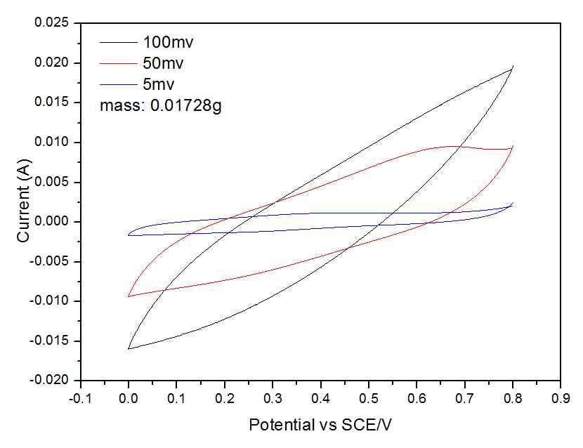 刚开始接触超级电容器,做了一下电极片CV测试,结果如第一张图所示,计算的到的比电容特别小,只有8点几法拉每克,相似的材料之前毕业了的师兄做有200多法拉每克,我完全是个电化学小白(?_?)学的是环境,实验室基本没有懂这方面的,之前做这个的师兄是第一个做这个的,现在也毕业了,看到这个结果完全不知是咋回事(?_?)盼望各位大神解惑。 我的材料是生物质炭复合了MnO,按照材料:乙炔黑:60%PTFE溶液为8:1:1,加入少许乙醇在研钵中研磨成膏状,然后擀到8*8cm的不锈钢网上,再用10MPa压力压片后90度烘干24小时。用三电极体系测试(用的是师兄定制的装置,如下图所示),电解质是0.5M的硫酸钠溶液,(之前师兄做的是KOH),在autolab上测得CV。关于电位窗口的选择也不太懂。 烦请各位大神提出你们宝贵的建议?ω?万分感谢! 发自小木虫Android客户端 |