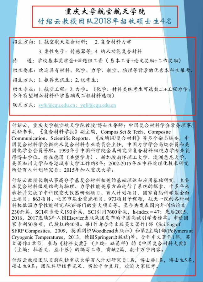 重庆大学航空航天学院 付绍云教授团队2018年硕士招生已有1人参与