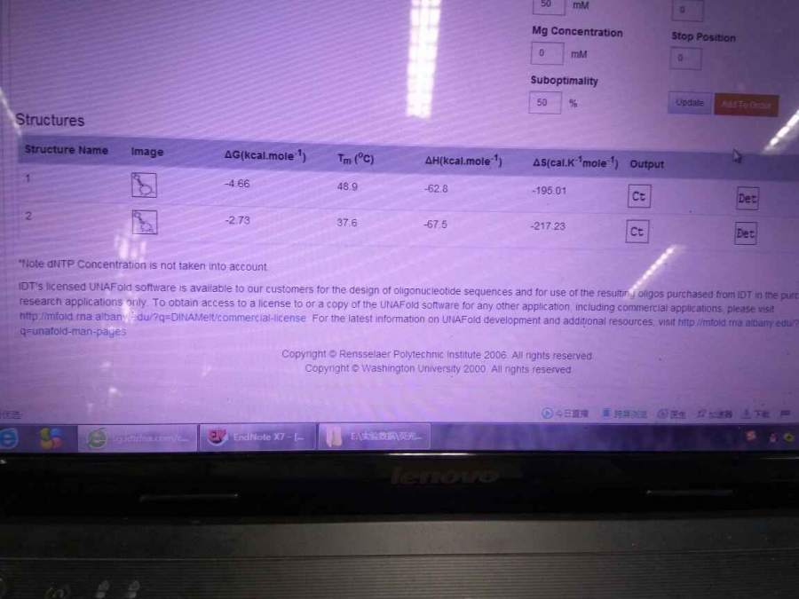 输入idt网址去看DNA是否有发卡结构,得到如下结果。不知道这个在常温下存在多不多?容不容易形成此种结构?请各位懂得同学帮助! 发自小木虫Android客户端 |