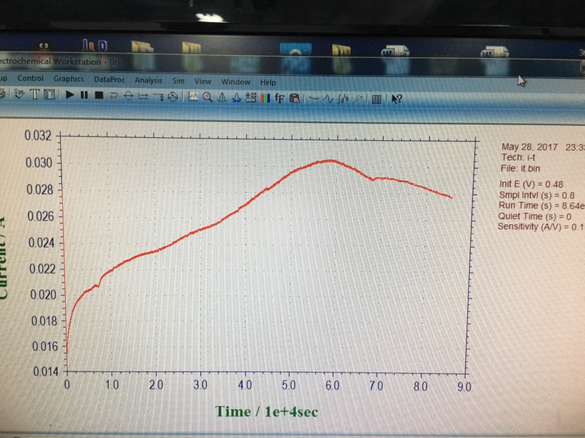 做OER反应 用时间-电流曲线来测试该电催化剂的稳定性 在设置产氧的初始电压和稳定性测试的时间之后 电流曲线一直是上升的 不清楚是怎么回事 请前辈指点 一般测试稳定性 肯定是随着反应的进行 电流是逐渐变小的 但是 我测的这个 电流一直是增大的 什么情况啊?测试时要不要搅拌?谢谢! @