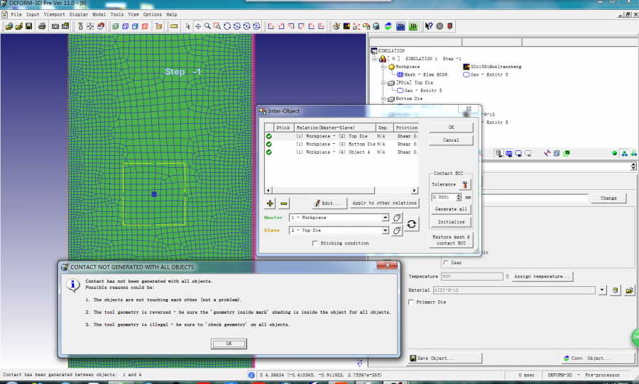 【求助】deform等模拟问题 想利用数值模拟软件模拟有关夹杂物对变形开裂的影响及其应力场分析,不知道哪个软件比较好,目前正在使用deform出现了很多问题,附件图只是其中一个问题,无法生成接触关系(图中黑点只是一个示意夹杂物大小): 1、workpiece和夹杂的尺寸可能相差太大,软件识别不了 2、关于夹杂物的添加用多项object是不是太麻烦了,有什么别的方法吗,毕竟夹杂物挺多的 1.png |