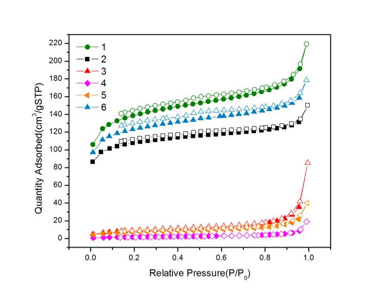 上面那三条是二型吸附曲线证明结构中包括中孔和大孔,下面这三条吸附量很小,基本上没有什么孔 发自小木虫Android客户端 |