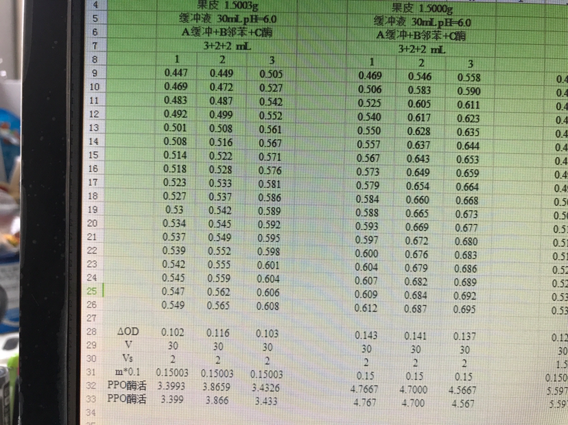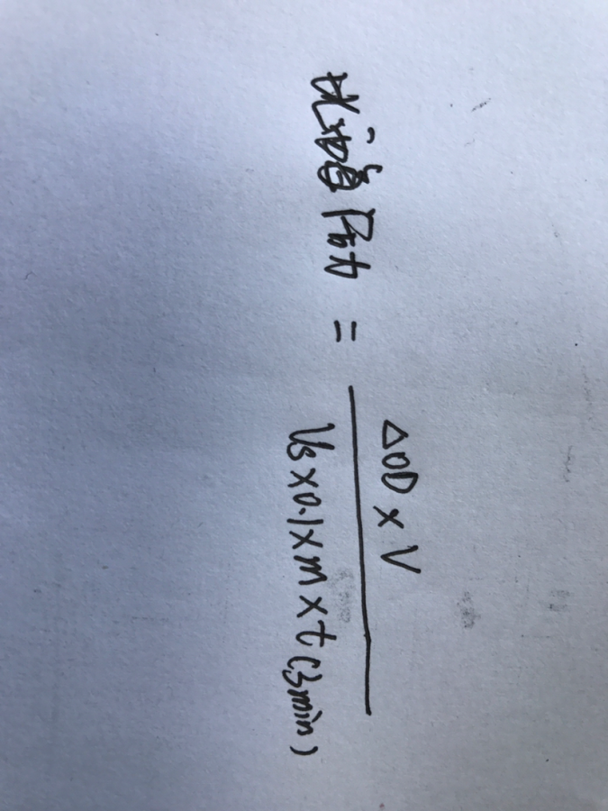 我通过紫外分光光度计测定PPO的吸光度值,结果是3分钟之内吸光度值变化如图1。计算公式是如图2。我提取是1.5g加缓冲液30毫升提取,离心得到粗酶提取液,然后测定是用缓冲液3毫升加底物邻苯二酚2毫升,粗酶液加2毫升,最后计算应不应该算后面测定时加入的缓冲液这个体积,因为我觉得相当于酶液又被稀释了,应不应该这样理解呢? 发自小木虫IOS客户端 |