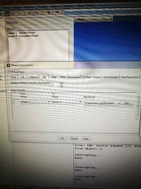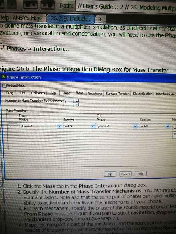 第一,主项是该设水呢还是蒸汽呢?(目前射的是蒸汽) 第二,在相间作用传质的机制mechanism)(下拉菜单中中选择和蒸发ˉ冷凝(evaporation_condensation)选项,里面的调节系数默认0.1没变,但是目前却没有发生相变,可能是什么原因呢? 第三,我看的fluent帮助中说,只要选了蒸发和冷凝模型前面的from phase都是液相,后面的to phase都是气相,我理解的对吗? 第四,如图,第一张图是我的设置选项卡,第二张图是来源于fluent帮助文档,为什么帮助里面的from phase 和to phase 后面比我多了两个species的下拉菜单? 发自小木虫Android客户端 |