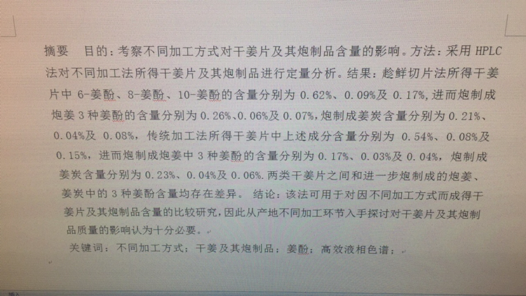 大家能帮忙看看英文摘要的翻译嘛。 摘要 目的:考察不同加工方式对干姜片及其炮制品含量的影响。方法:采用HPLC法对不同加工法所得干姜片及其炮制品进行定量分析。结果:趁鲜切片法所得干姜片中6-姜酚、8-姜酚、10-姜酚的含量分别为0.62%、0.09%及0.17%,进而炮制成炮姜3种姜酚的含量分别为0.26%、0.06%及0.07%,炮制成姜炭含量分别为0.21%、0.04%及0.08%,传统加工法所得干姜片中上述成分含量分别为0.54%、0.08%及0.15%,进而炮制成炮姜中3种姜酚的含量分别为0.17%、0.03%及0.04%,炮制成姜炭含量分别为0.23%、0.04%及0.06%.两类干姜片之间和进一步炮制成的炮姜、姜炭中的3种姜酚含量均存在差异。 结论:该法可用于对因不同加工方式而成得干姜片及其炮制品含量的比较研究,因此从产地不同加工环节入手探讨对干姜片及其炮制品质量的影响认为十分必要。 关键词:不同加工方式;干姜及其炮制品;姜酚;高效液相色谱; 发自小木虫IOS客户端 |