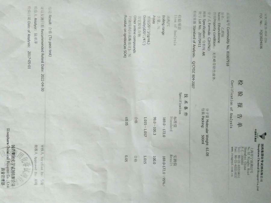 本人色谱经验不足,化学知识也忘得差不多了,现在在研究样品中的已知杂质(乙醇胺)遇到问题,束手无策,望有人赐教,在此感谢! 色谱条件:示差检测器,色谱柱C18 流动相:甲醇-水(10:90),水溶液组成10mM庚烷磺酸钠,10mM磷酸氢二钾,磷酸调PH3.0,柱温及检测器温度40℃, 乙醇胺供试品溶液配制:取一滴乙醇胺(分析纯)于10mL容量瓶,加流动相稀释定容,即得。 图谱如下,分别是空白(流动相)与乙醇胺叠加图,样品与乙醇胺叠加图,乙醇胺(AR)检验报告 发自小木虫Android客户端 |