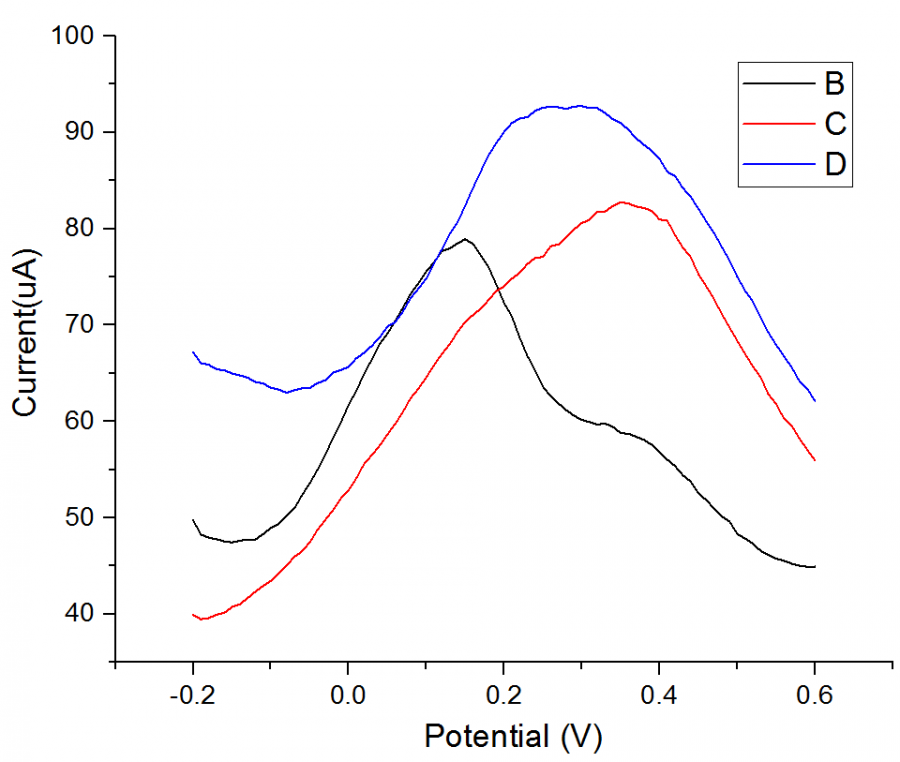 测试:对电极铂电极,Ag/AgCl参比电极;PBS(10mM PBS,1M NaCl,1mM Mg2+,pH7.0);-0.2~0.6V;Amplitude 25mV;10mV/s;50Hz