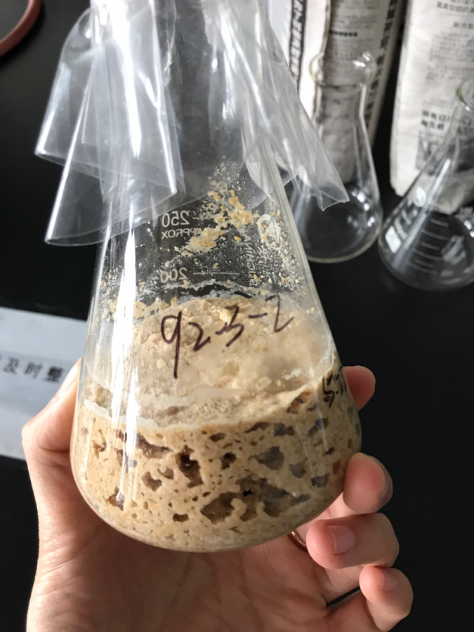 各位大神,我用小麦培养基培养镰刀菌产毒,先把小麦磨粉灭菌,然后50g小麦粉加入60ml无菌水后接种镰刀,但是不知道是不是水加少了,很难摇,容易结块,而且长孢,这影不影响产毒啊?或者我需要重新做?我之前做的那一批没有固定加水量,加到可以摇动为止,培养出来是下图这样的。感觉正常应该是这样子的。 发自小木虫IOS客户端 |