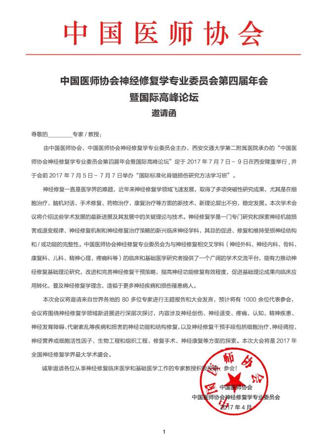 中国医师协会神经修复学专业委员会第四届年会暨国际高峰论坛