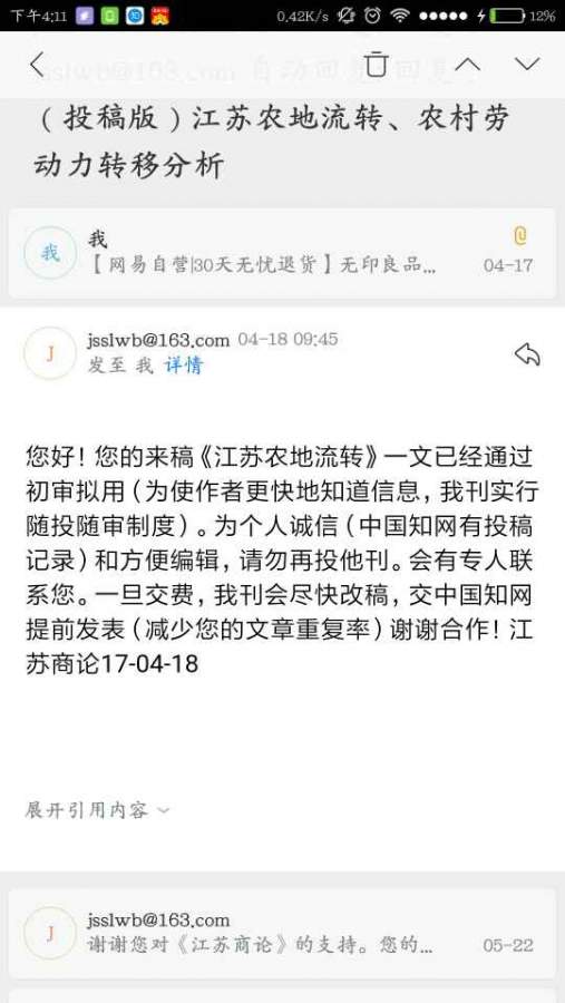 我的论文投了江苏商论,4月18号有初审拟用信息,之后就再也没有后续消息,也没有退稿通知,也没有付款通知